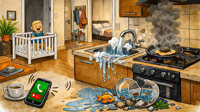 Quindi, si apre la porta della stanza e si vede il caos. Il bambino piange, il telefono squilla a vuoto, il cibo brucia sul fornello, il lavandino è intasato e l’acquario è rotto.
