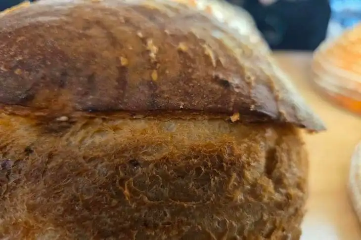 Il pane ha una crosta spessa e croccante e una mollica perfetta.