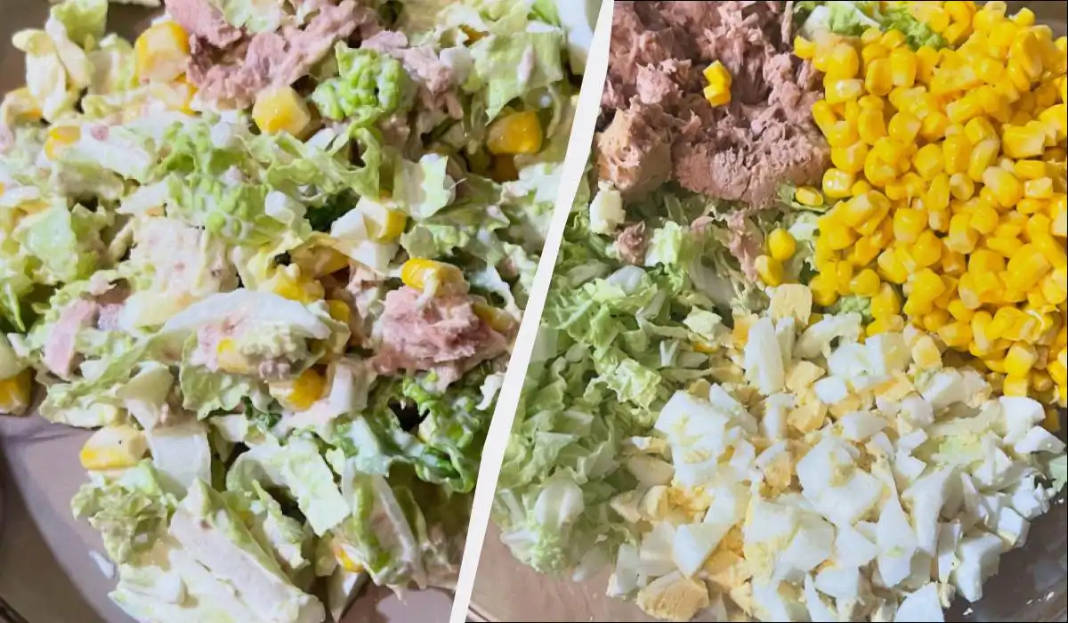 Lessare le uova sode e tagliarle a cubetti. Tritare finemente il cavolo. Scolare il tonno e il mais. Mescolare tutti gli ingredienti. Condire l’insalata di tonno con cavolo e mais alla pechinese con panna acida, maionese o una miscela di queste salse, oltre a condire e salare.