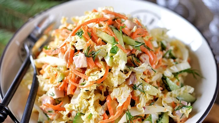 - Mettere il cavolo di Pechino, le carote, il cetriolo, i bianchi, le verdure in una ciotola, salare, mescolare delicatamente, versare il condimento e mescolare di nuovo.